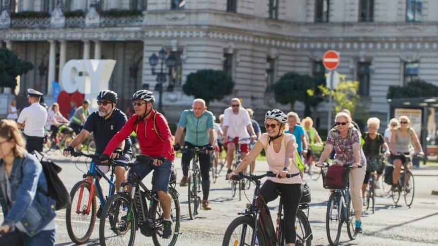 Pintér Bence, Győr polgármestere köszöntötte a Városháza előtt gyülekező kerékpárosokat: