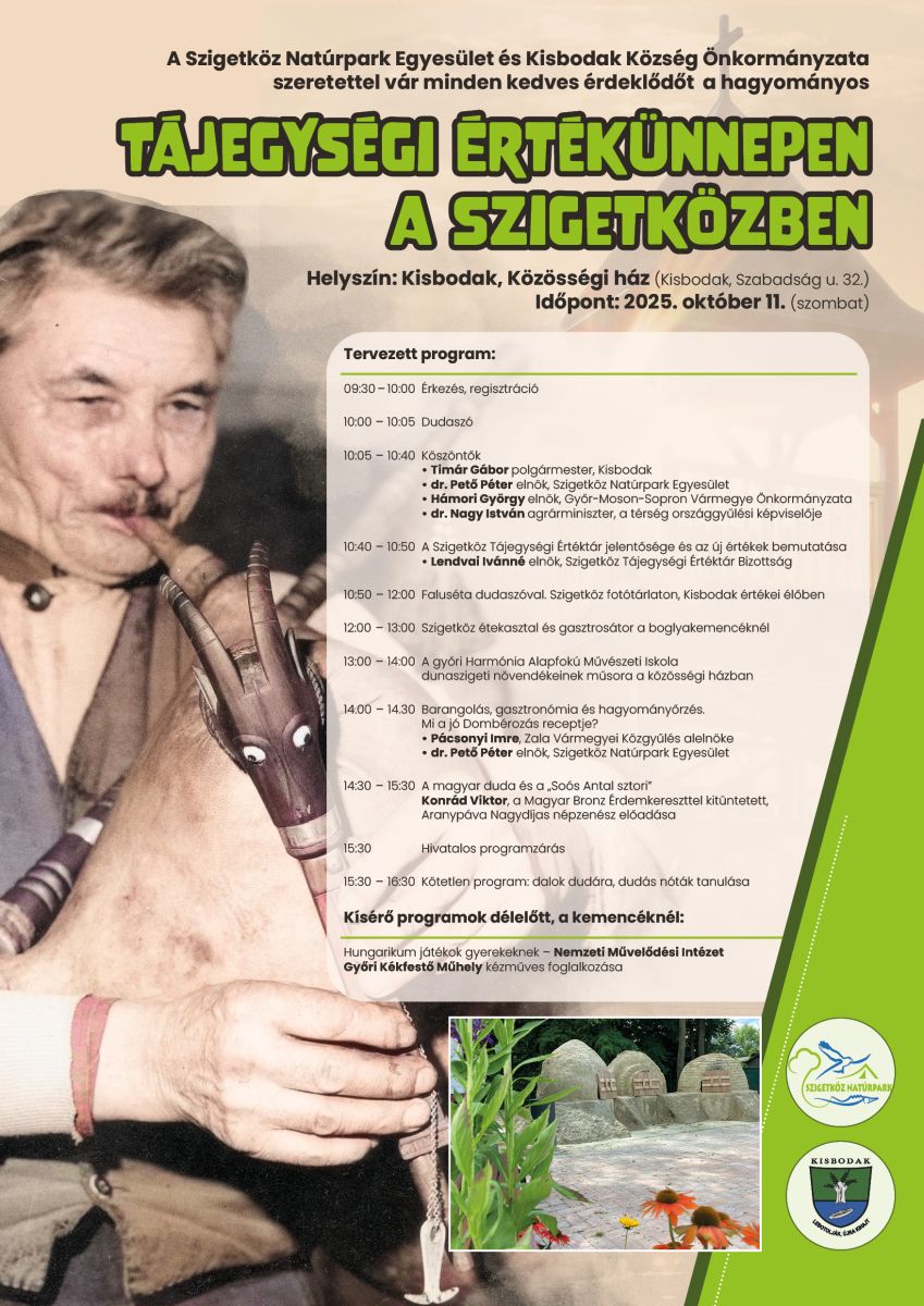 A Szigetköz Natúrpark Egyesület most rendezi V. Tájegységi Értékünnepét, amelynek ezúttal Kisbodak ad otthont. Mint írják, az idei értékőrző ünnep már régóta a megyerikumok között szereplő szigetközi dudás hagyományok felelevenítésére épül, és a natúrpark települései úgynevezett tájegységi értékasztalon mutatják be hagyományaikat és gasztronómiai különlegességeiket.
