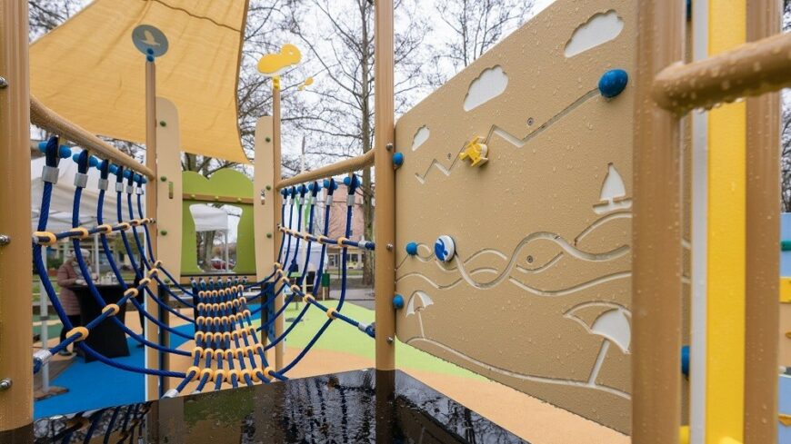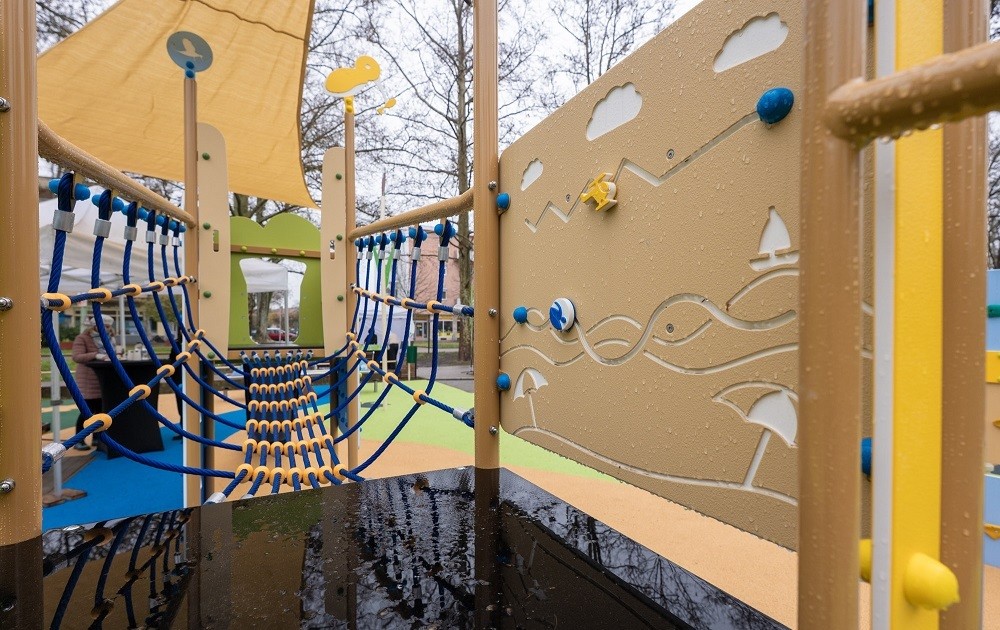 A tér középpontjában egy kéttornyos kombinált csúszdával, mászókával és edukációs panelekkel ellátott eszköz áll. A játszótér teljes területe kerekesszékkel is bejárható, az edukációs panelek pedig ülő helyzetből is könnyen elérhetőek.