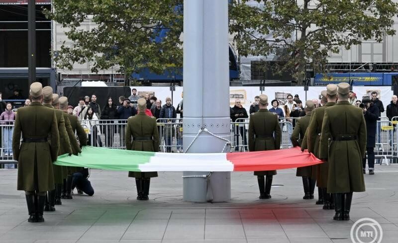 Katonai tiszteletadással, Szalay-Bobrovniczky Kristóf honvédelmi miniszter és Böröndi Gábor vezérezredes, a Honvéd Vezérkar főnöke jelenlétében felvonták a nemzeti lobogót az 1956-os forradalom és szabadságharc 69. évfordulóján Budapesten, az Országház előtti Kossuth Lajos téren.