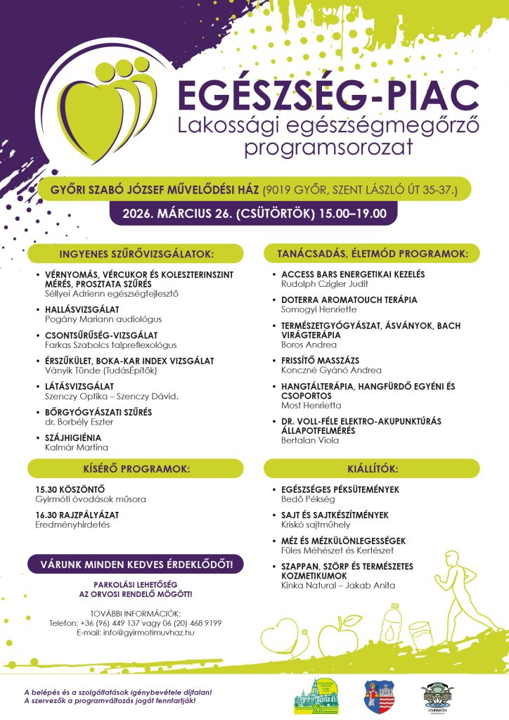 Tavasszal ismét elindul az Egészség-Piac lakossági egészségmegőrző programsorozat Győrben. A népszerű rendezvény célja, hogy közelebb hozza az egészségtudatos életmódot a városrészekben élőkhöz, és lehetőséget biztosítson ingyenes szűrővizsgálatokra, tanácsadásokra, valamint közösségi élményekre.