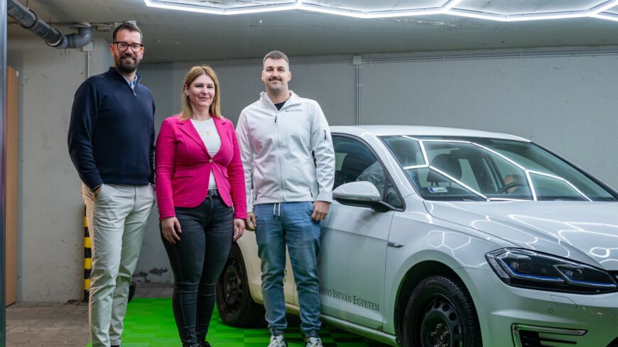 A P1-es parkolólemezben kialakított helyszínen egyszerre két járművet tudnak majd fogadni, de a későbbi tervek között szerepel a campuson belüli mobil szolgáltatás bevezetése is. (Fotó: Dudás Máté/Széchenyi István Egyetem)