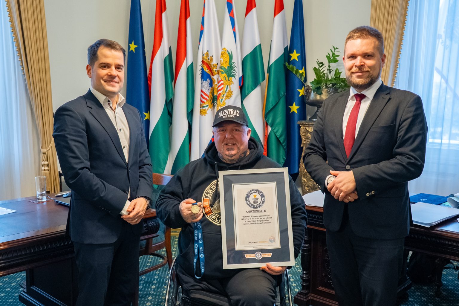 Patkás Tamást, a győri paraúszó világrekorder sportolót köszöntötte Pintér Bence polgármester és Kósa Roland alpolgármester a győri városházán, elismerve páratlan sportteljesítményét és példamutató életútját.