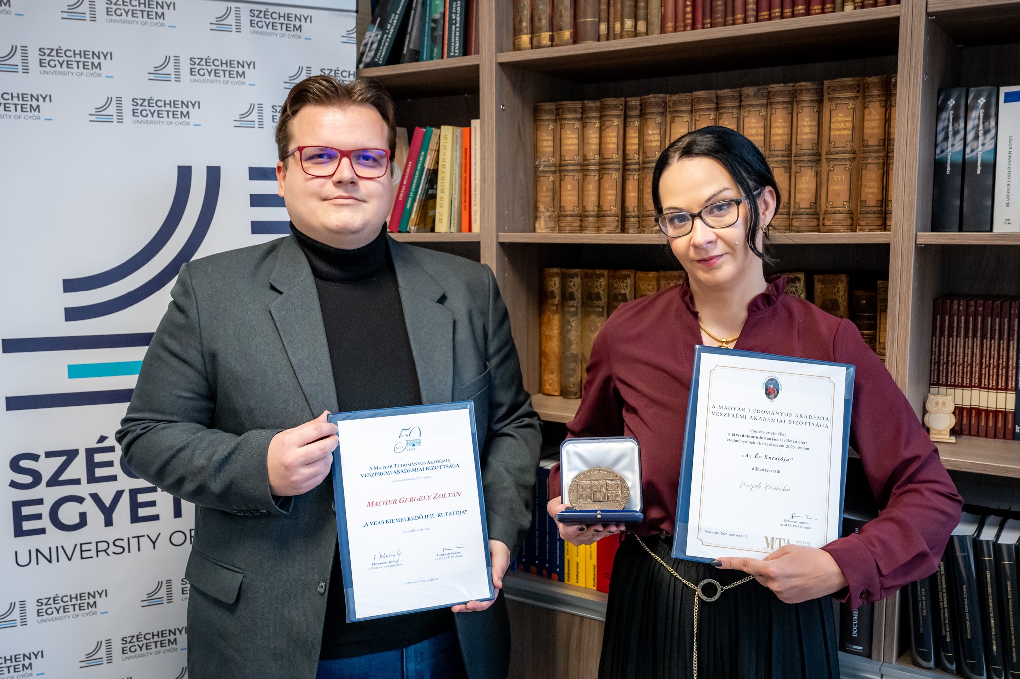 A Magyar Tudományos Akadémia (MTA) Veszprémi Területi Bizottsága nemrég a győri Széchenyi István Egyetem két oktatóját is elismerésben részesítette: dr. Nogel Mónika, az Állam- és Jogtudományi Doktori Iskola tudományos igazgatója az Év Kutatója 2025 díjban részesült, Macher Gergely Zoltán, az Alkalmazott Fenntarthatóság Tanszék egyetemi tanársegédje pedig Kiemelkedő Ifjú Kutató 2025 kitüntetést vehetett át.